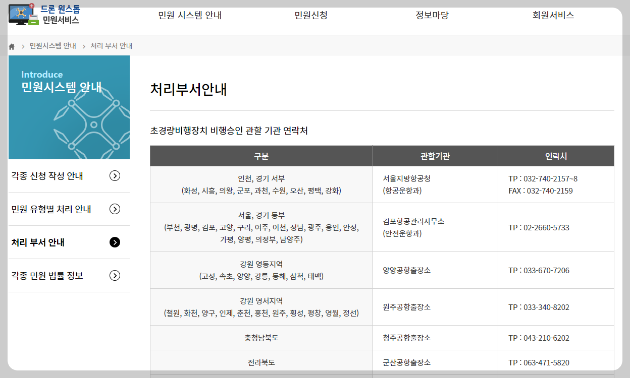 드론 원스톱 - 민원시스템 안내 - 처리부서 안내를 보면, 초경량 비행장치 비행 승인 관할 기관 연락처, 관제권 및 군 관할 구역 비행 승인 관련기관 연락처, 항공촬영 승인업무 책임부대 연락처, 장치 신고 및 사업등록 연락처를 볼 수 있다. 해당되는 지역에 연락을 해보면 된다.