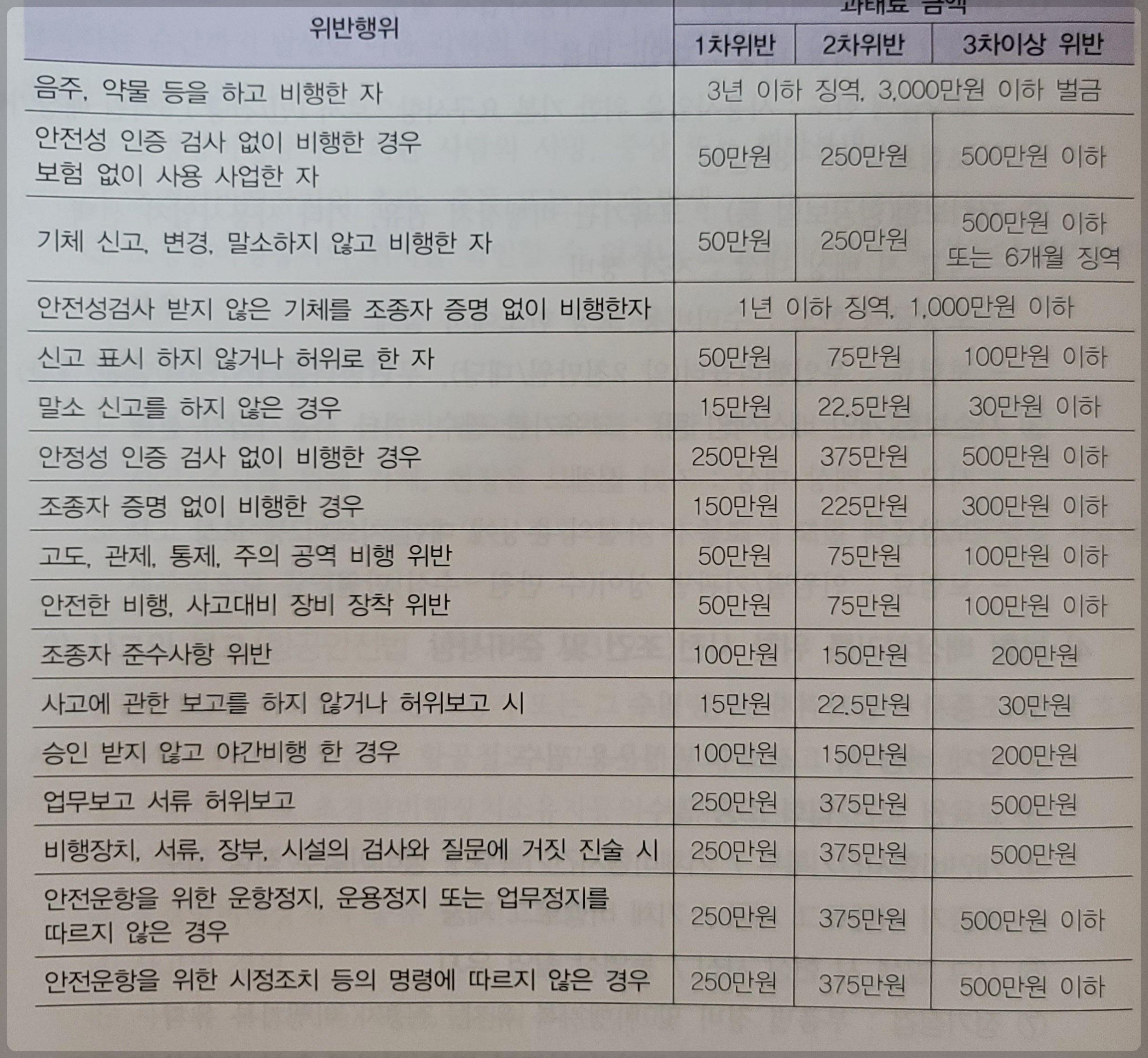 1차 위반에서 벌칙이 강한 것은 위에 경우를 포함해서 안전성 인증 검사 없이 비행한 경우, 업무 보고. 서류 허위보고, 비행장치. 서류. 장부. 시설의 검사와 질문에 거짓 진술 시, 안전 운항을 위한 시정조치 등의 명령을 따르지 않는 경우가 있는데, 이것은 교육기관 등에 해당사항이 있는 것이다.